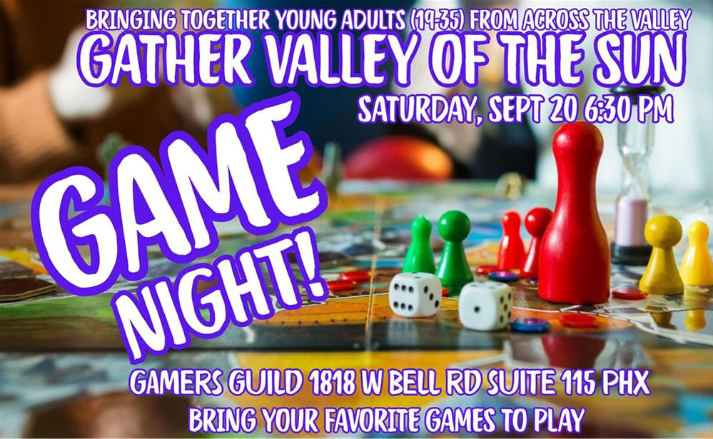 ULC Young Adults along with Gather Valley of the Sun will be co-hosting a game night this Saturday, Sept 20, at 6:30 pm. The location will be Gamer’s Guild in Phoenix – 1818 W Bell Rd. Please invite a friend, and you can even bring your own game(s) if you’d like! See you there!